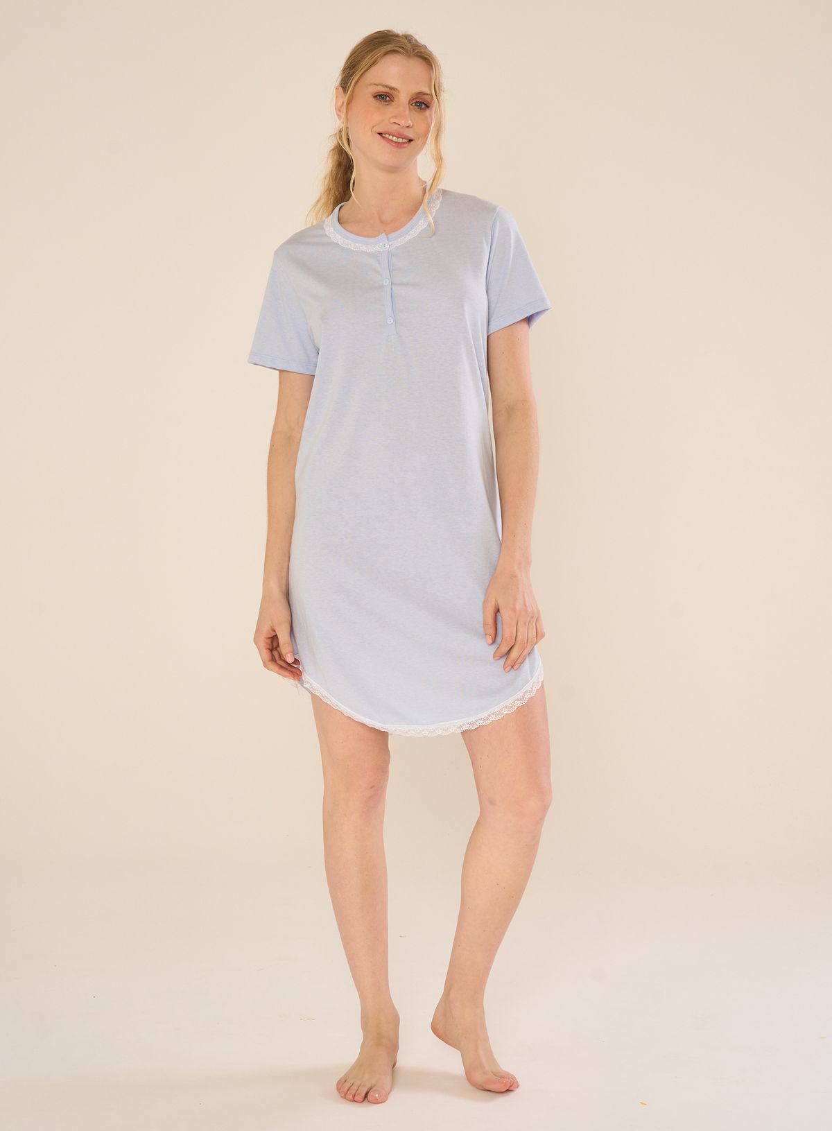 El detalle de puntilla en el escote y ruedo le da un toque romántico, mientras que el cuello con botones frontales facilita la lactancia de forma práctica y discreta.