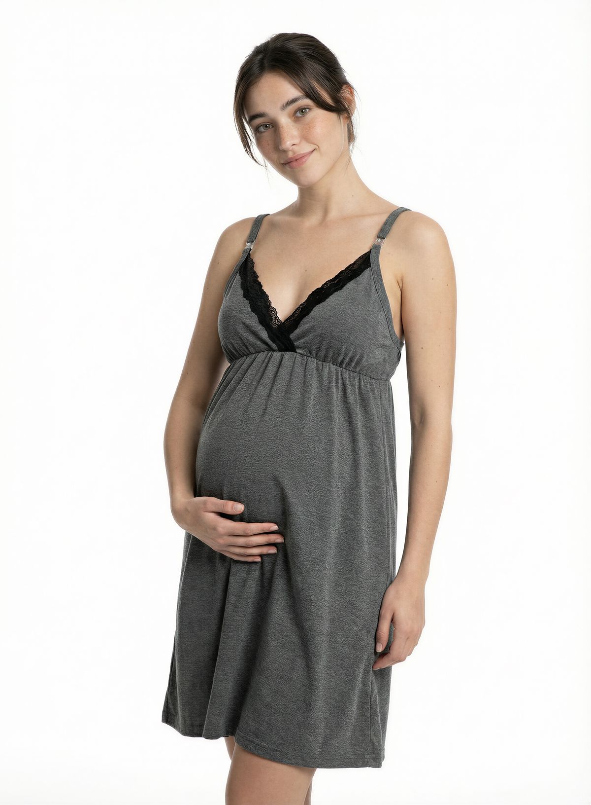 Cuenta con breteles regulables y prácticos broches de apertura frontal que facilitan la lactancia de manera simple y cómoda. Su diseño funcional y delicado la convierte en una prenda ideal para usar de noche o durante el día en casa.