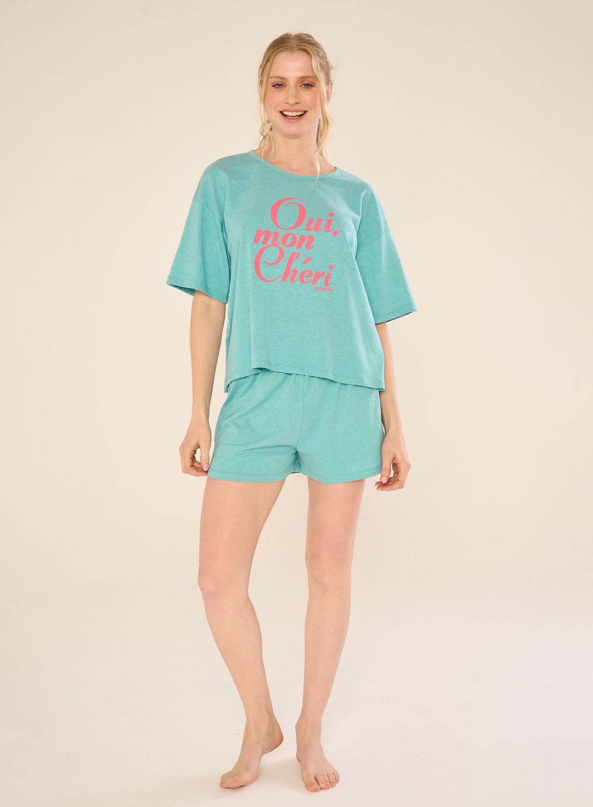 Viví la comodidad con el Pijama Amour de Mariené. Confeccionado con jersey de algodón, trae remera de mangas cortas con estampa “Oui, mon Chéri” y short a juego. Un diseño relajado, ideal para descansar o estar en casa con frescura.
