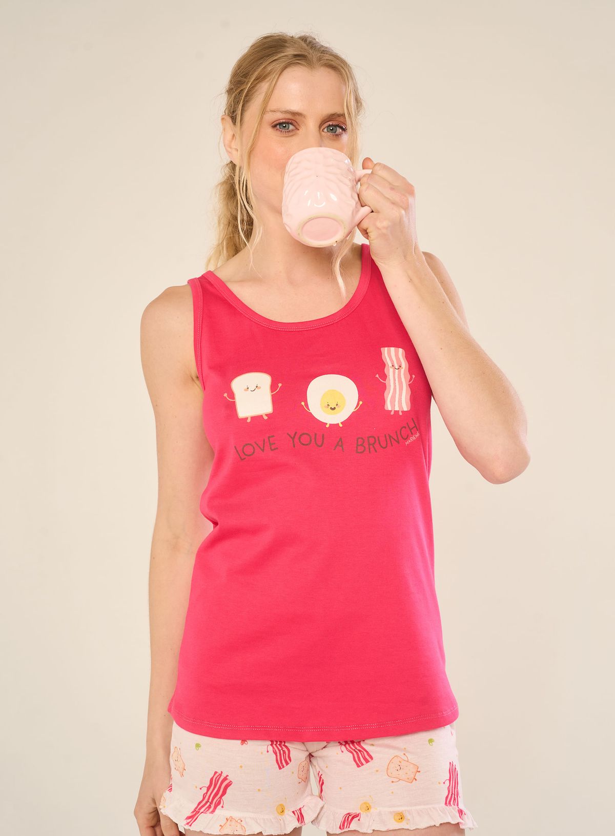 El pijama Breakfast de Mariené es un conjunto veraniego compuesto por musculosa y short, confeccionado en una suave mezcla de algodón y poliéster. El short se destaca por su detalle de volados y una divertida estampa. Fresco, cómodo y lleno de onda, ideal para los días de calor.