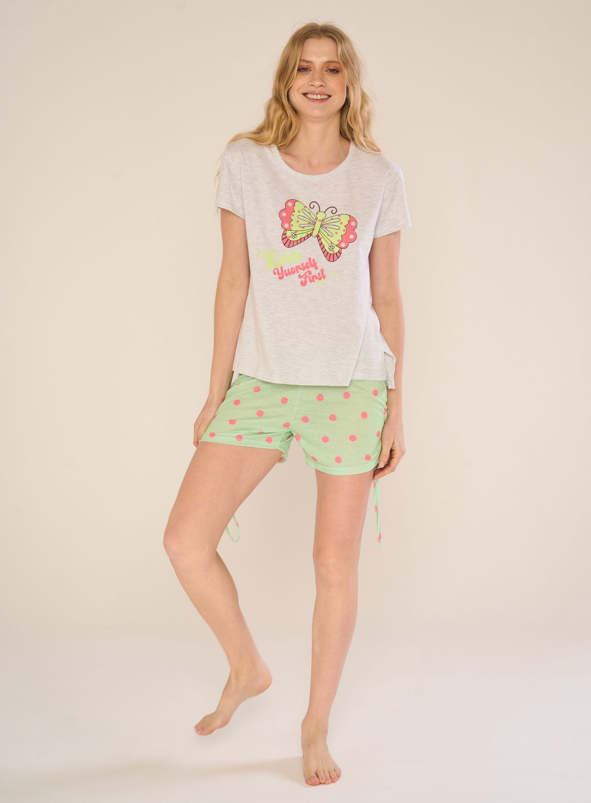 El Pijama Butterfly de Mariené es un conjunto de verano ideal para las noches más cálidas. Incluye una remera con un encantador estampado de mariposa y la frase “Love yourself first”, junto con un short con frunces laterales regulables que aportan un toque femenino y cómodo. Confeccionado en jersey suave y liviano, combina comodidad, estilo y color en una propuesta perfecta para descansar o disfrutar en casa.