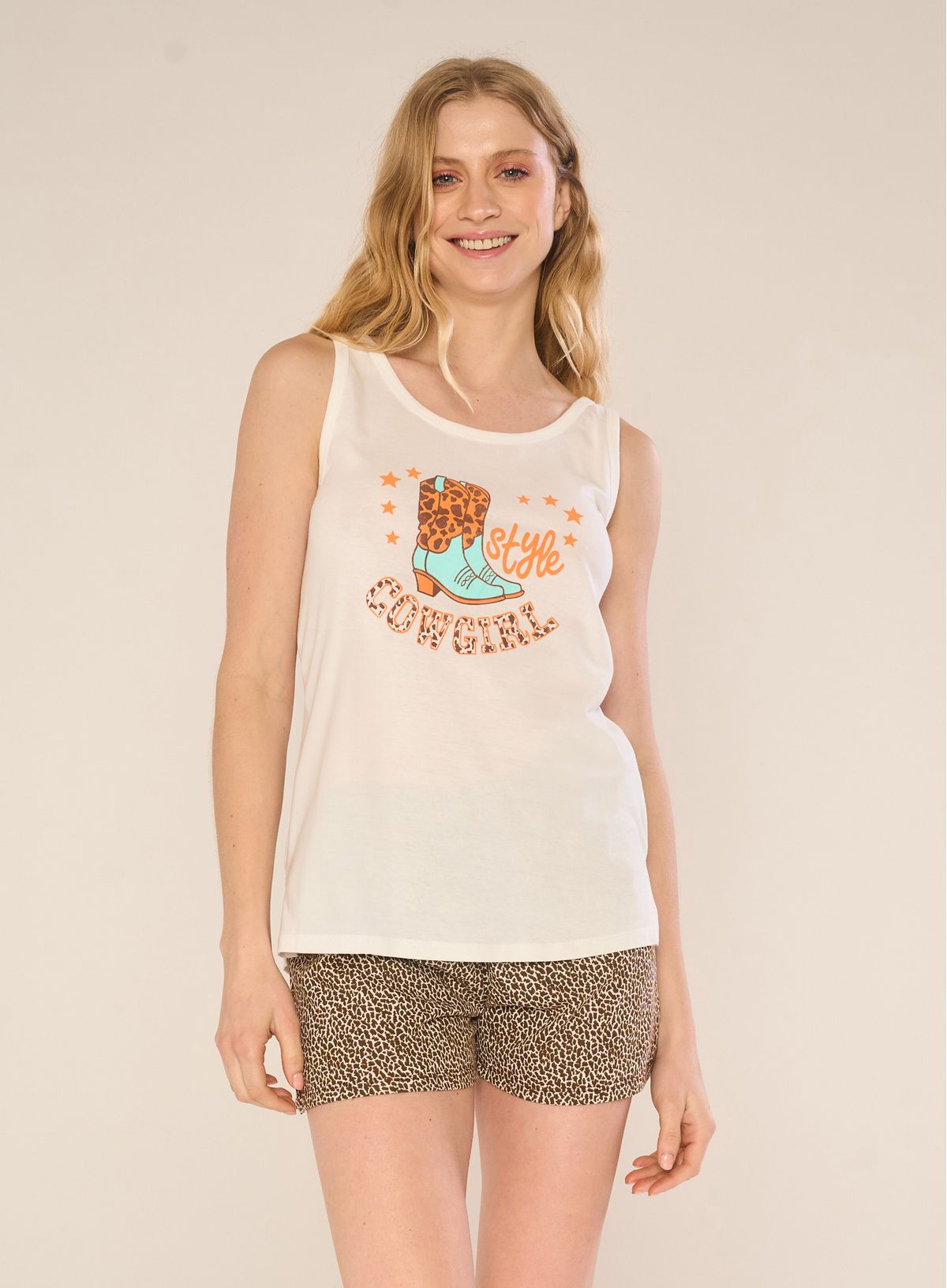 Sumá diversión y comodidad a tus noches con el Pijama Cowgirl de Mariené. Confeccionado en suave jersey estampado, brinda una textura ligera y agradable al tacto, ideal para dormir o relajarte en casa. La musculosa sin mangas con estampado “Cowgirl” le da un toque juvenil y descontracturado, mientras que el short estampado con cintura elástica asegura un calce perfecto y libertad de movimiento. Disponible en combinaciones de rosa claro y hueso, para que elijas la que más te guste.