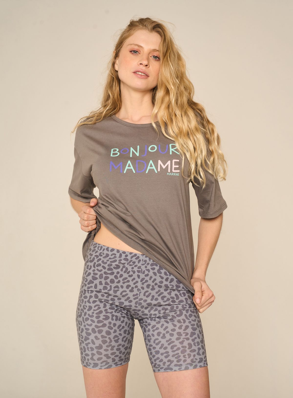 El Pijama Urban Safari de Mariené es un conjunto versátil y con mucho estilo, ideal para el verano. Incluye una remera con diseño y una biker con estampado animal print que le da un toque salvaje y moderno. Confeccionado en jersey con lycra, se adapta cómodamente al cuerpo. Podés usarlo como pijama o como look relajado para salir de casa. Disponible en dos combinaciones.