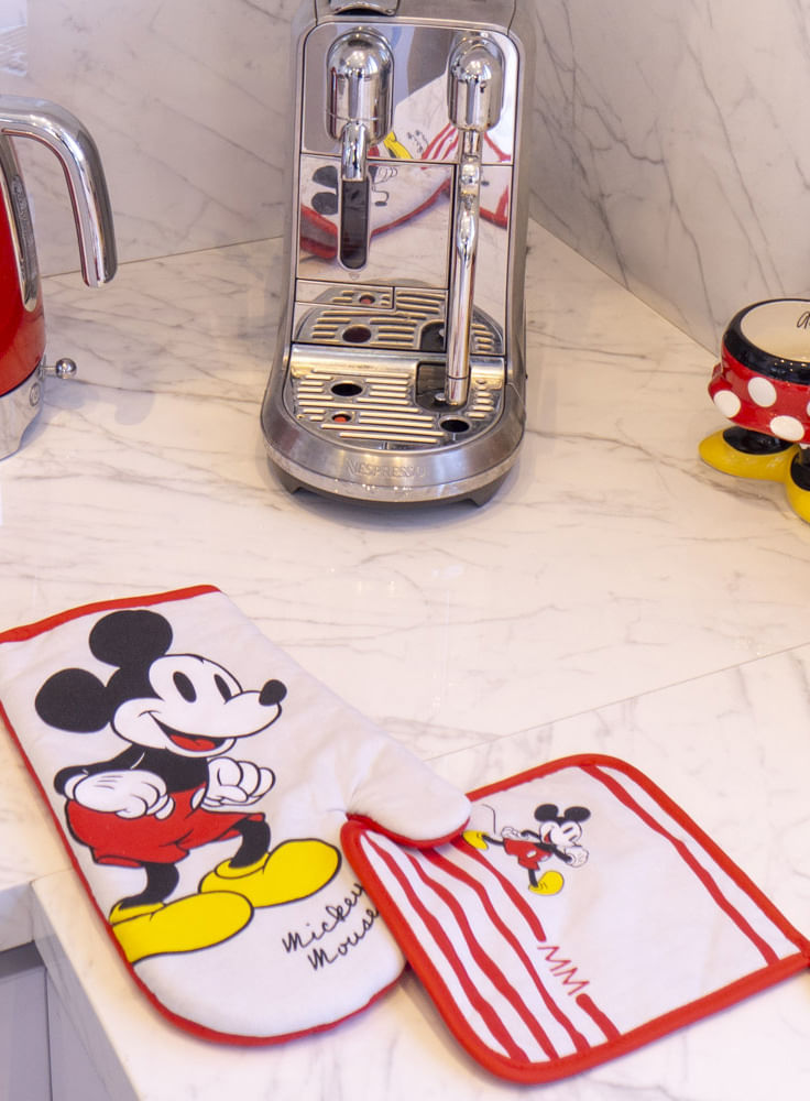 El combo contiene una manopla y una agarradera con el diseño original de Mickey para que tu cocina tenga un toque especial.
