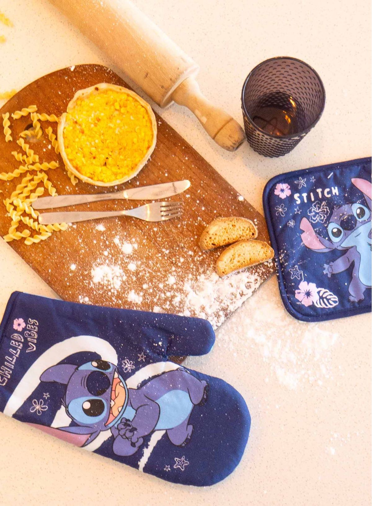 El combo contiene una manopla y una agarradera con el diseño original de Stitch para que tu cocina tenga un toque especial.